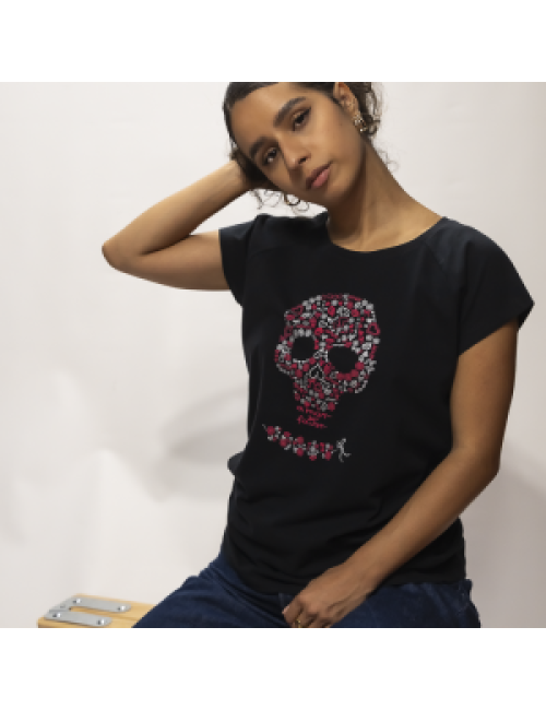 This t-shirt is made from 100% cotton with a carbon treatment that provides a soft, peach-skin feel. It features a crew neck and raglan sleeves. The screen-printed skull design stands out, available in pink and black or pink and silver, depending on the t-shirt's base color. An embroidered logo detail adorns the back.
