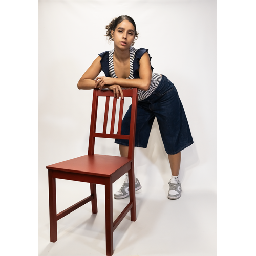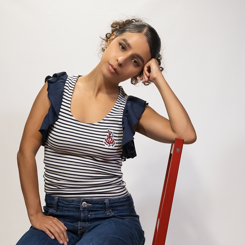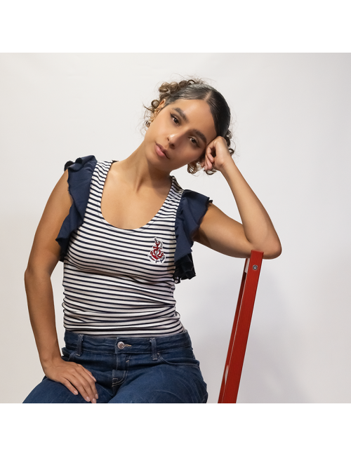 Fitted Anchor Top in blue and white striped ribbed knit with wide ruffles at the shoulder that end below the armhole. Made of navy blue cotton. An anchor and the brand name are embroidered on the chest.