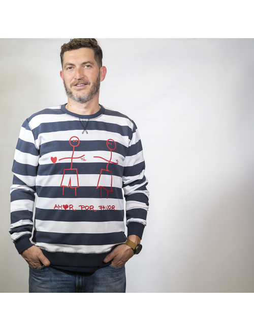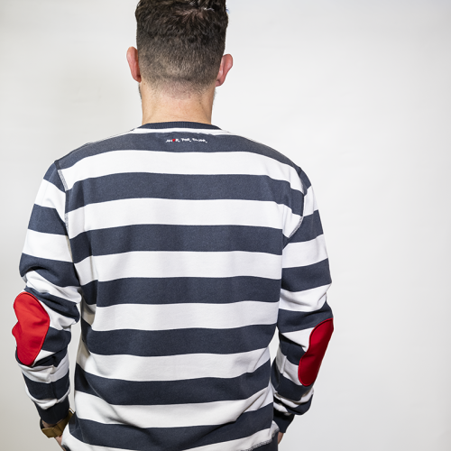 Navy and white striped sweatshirt made from 100% cotton fleece. Crew neck with a quilted finish. Red elbow patches. Red brand logo print on the front. Logo detail on the back.