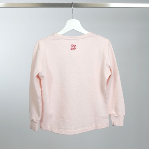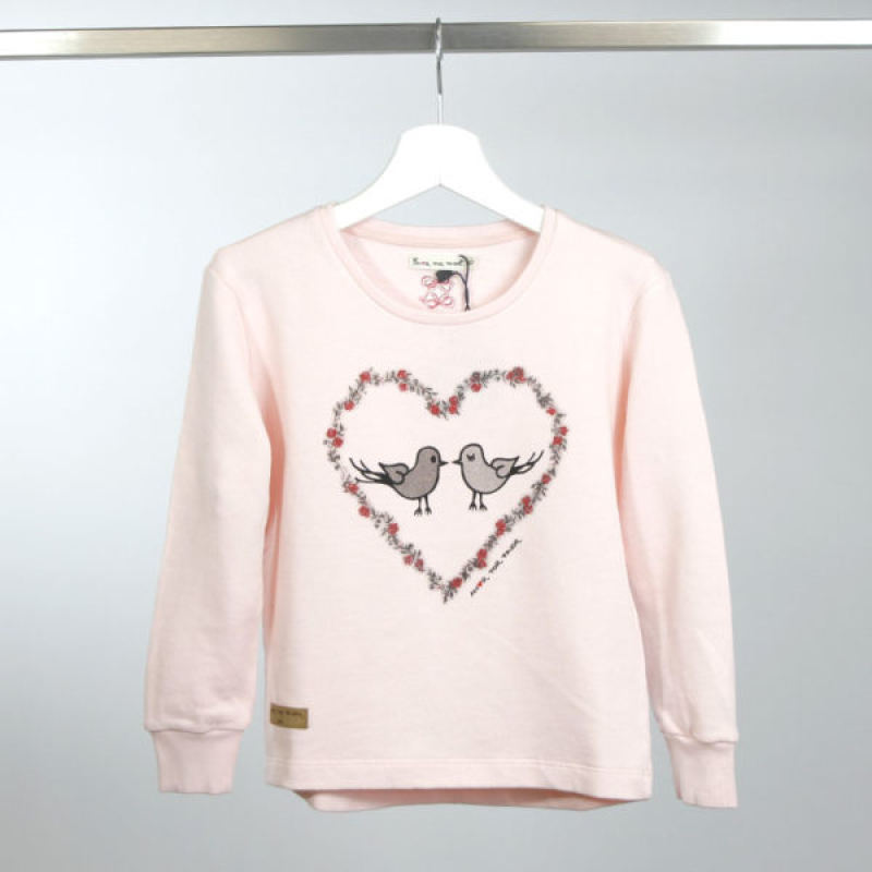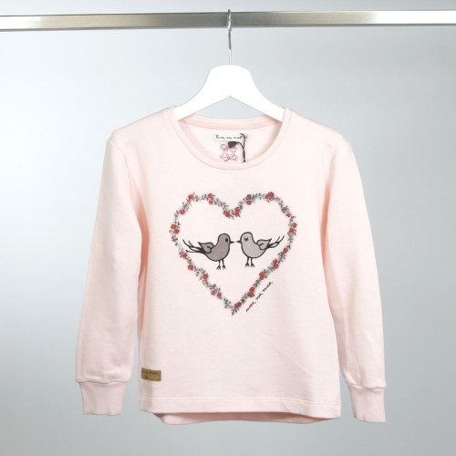The Birds sweatshirt is a long-sleeved children's garment with cuffs and a round neck, made from fine, unbrushed 100% cotton fleece in a quartz pink color. The back hem is rounded and slightly longer than the front hem, without cuffs. It features a print of little birds framed in a heart and the brand name in shades of gray, black, and red. A vegan leather label with the brand logo is located on the front, and embroidered bow details adorn the back.