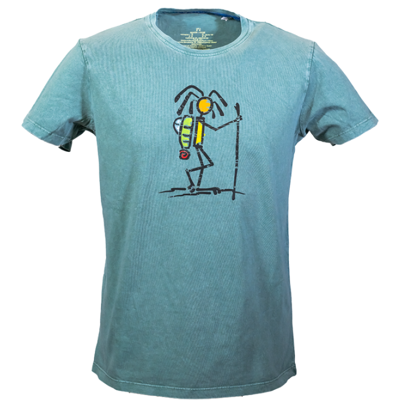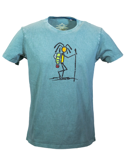 T-shirt made in Catalonia from 100% cotton with a pigmented wash finish. It features a velvet ribbon trim along the inner neck seam, with each piece being unique and handmade in a different color. The cut is straight, unisex, with short sleeves and a DTF print.
