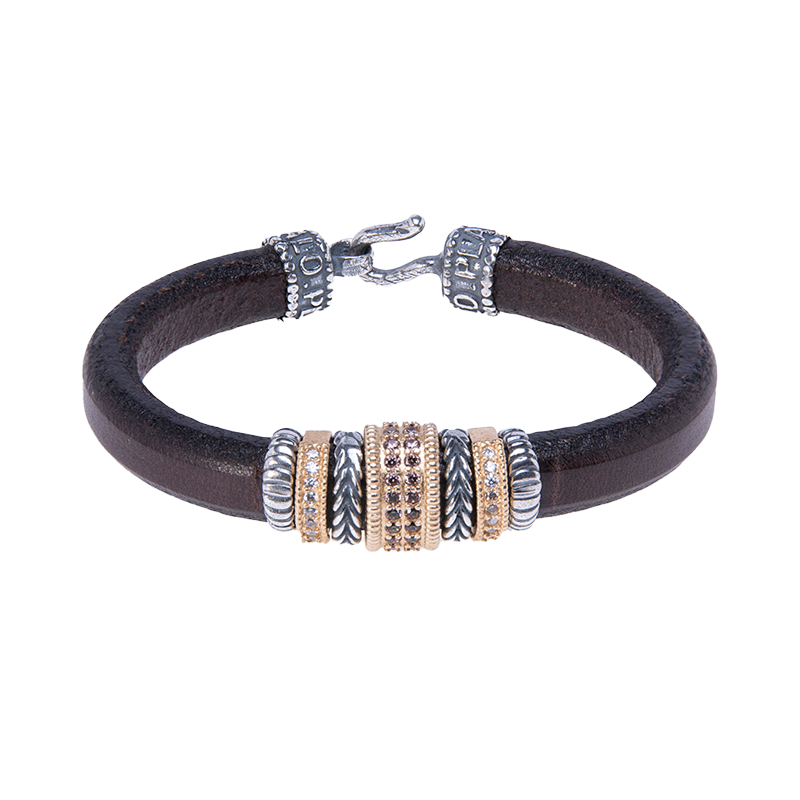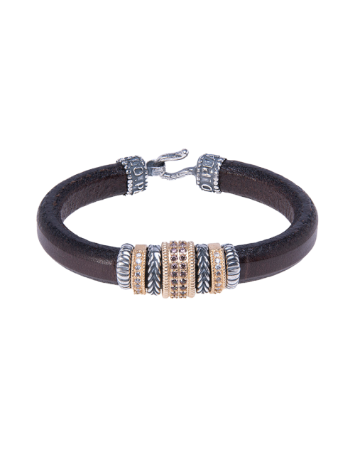 Pulsera hecha a mano en cuero marrón, de 10mm de ancho y 0,5mm de grosor, con entrepiezas de plata 925 y baño de oro. Tiene una pieza central de plata chapada en oro con 26 circonitas facetadas, y dos piezas bañadas con 9 circonitas cada una, dándole a la pulsera un carácter elegante pero desenfadado.