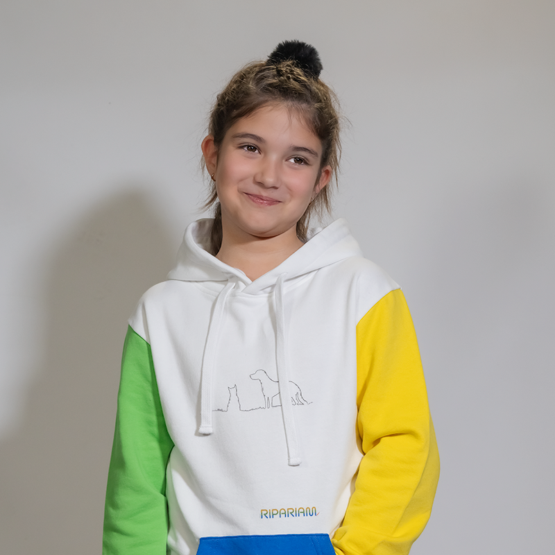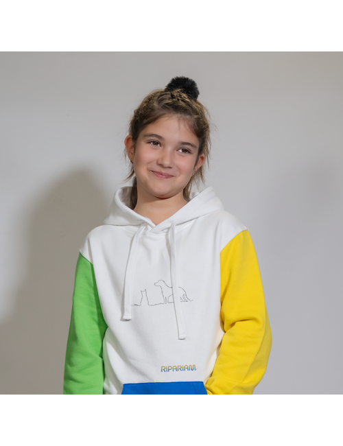 Sudadera infantil confeccionada íntegramente en 100% algodón. Cuerpo principal en blanco con mangas en verde y amarillo respectivamente y el bolso principal en azul. Tiene un pequeño diseño minimalista en el centro frontal. Prenda elegante, cómoda y envolvente