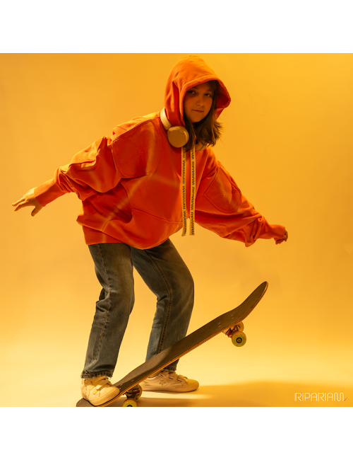 Espectacular diseño para esta sudadera urbana confeccionada íntegramente en algodón de 420 gr. Tiene una base naranja y un degradado en la capa superior que le da un aspecto desgastado contiene refuerzos en hombreras y codos en forma de parches. Una pieza pensada para disfrutar en todas las ocasiones. Tamaño oversize. La talla M (foto) mide 69cm X 56cm.