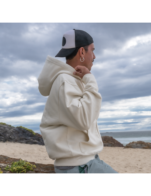 Sudadera abierta en color blanco roto con capucha y cordones del mismo color. Cierre de cremallera. Confeccionado artesanalmente en 100% algodón con un gramaje de 1.360gr y medidas oversize, en la fotografía es una talla M con medidas de 74cm X 63cm. Una prenda ideal para cualquier ocasión con un diseño elegante.