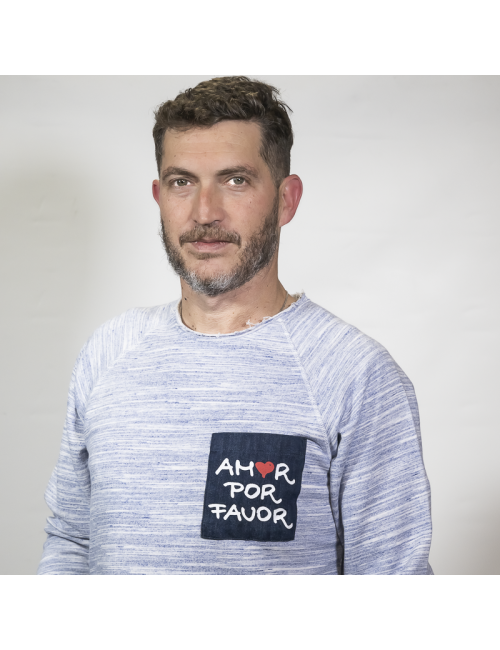 Sudadera de felpa 100%, en algodón de color azul jaspeado.Manga Raglán.Bolsillo de tela vaquera en el delantero con el logo Amor Por Favor.Etiqueta de piel con logo en el bajo.