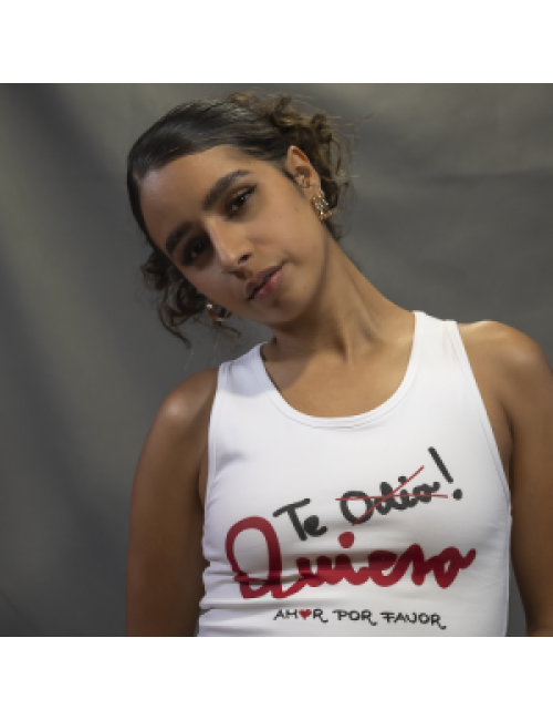 A segunda capa máis curta leva o estampado (No) Te Odio-(Te) Quiero en cor vermello e negro e logo da marca.