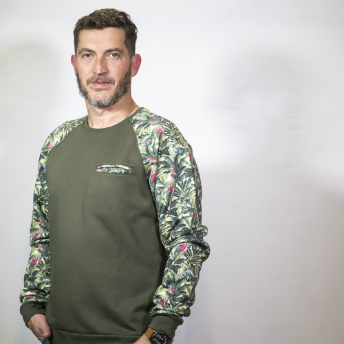 Suadoiro Hawaii confeccionado en algodón e poliéster ao 50 %. Ten gola redonda de 1 cm con pespunte, e manga ranglan con puños de canalé de 5,5 cm.